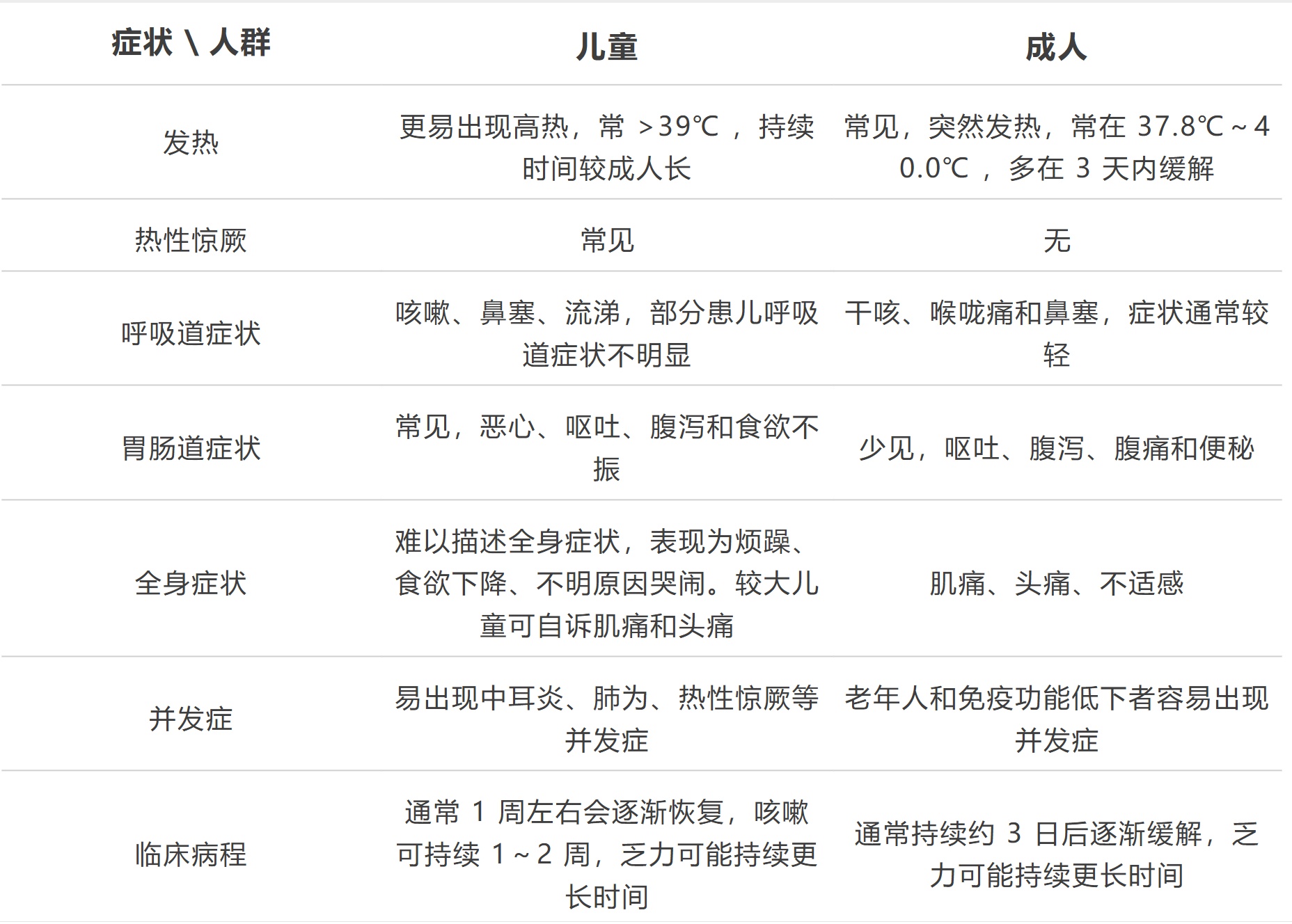与成人相比,感染流感的儿童更容易出现高烧,并伴有恶心呕吐、烦躁、厌烦等全身症状。