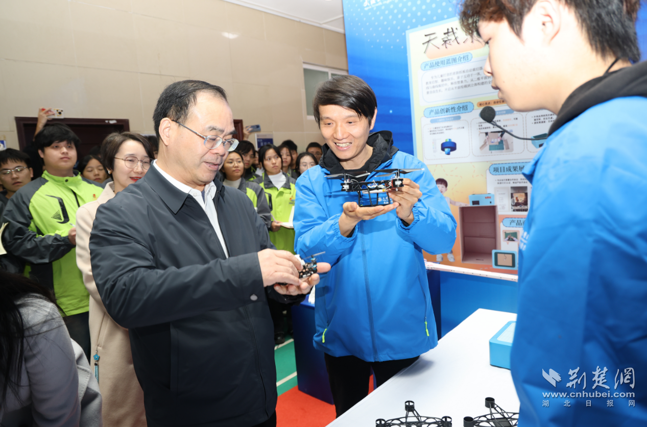 来到“思想政治教育奖项”展区,91件省级以上荣誉奖牌、证书筑起一道“光荣之墙”,默默诉说着去年五角学院思想政治教育的剩余成绩。在“知行合一”展区,师生们通过视频了解了学生参与社交技能和志愿服务的青春风采。创新创业展位上,展出了2025年“互联网+”创新创业大赛获奖实景作品——“马良盒子”3D便携式打印机、“天才乐”儿童自动切割机和最轻的四旋翼轻量级无人机。遍布整个网络。项嘉文书记认真听取了获奖师生团队项目的介绍,不时点头询问技术细节和市场前景,并鼓励同学们“充分将变革融入专业精神”。在充满青春气息的校园文创展区,项嘉文书记饶有兴趣地观看了一系列基于校徽、建校70周年等元素开发的文创产品和学院特色作品。他表示肯定,将学生对学校的热爱与审美创造力融入到既具有教育意义又具有实用价值的设计作品中。