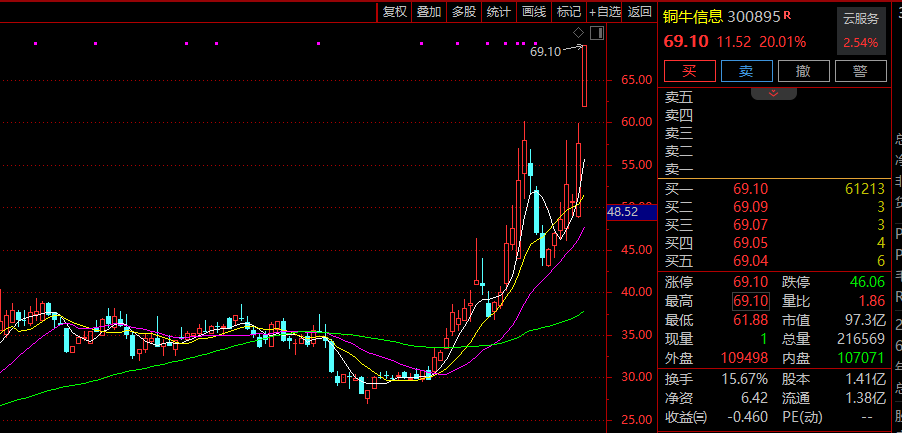 本日早盘,A股小幅震动,重要股指涨跌互现,深证成指、科创50、北证50等微幅飘红,上证指数、沪深300、创业板指等则微幅飘绿。上涨个股略多于下跌个股,成交呈平和缩小趋向。盘面上,播送电视、国资云、人工智能、城市振兴等板块涨幅居前,工程机器、医疗美容、酿酒、航空机场等板块跌幅居前。人工智能推进云市场高速开展云观点早间全线走强,国资云偏向领涨,板块指数高开高走,盘中放量年夜涨逾3%,迫近汗青最高点。铜牛信息直线拉升,收盘不到10分钟就20%涨停,股价创汗青新高(复权,下同),湖北广电一字涨停,持续第5日封板,创2年来新高,天威视讯、美利云等亦强势涨停。